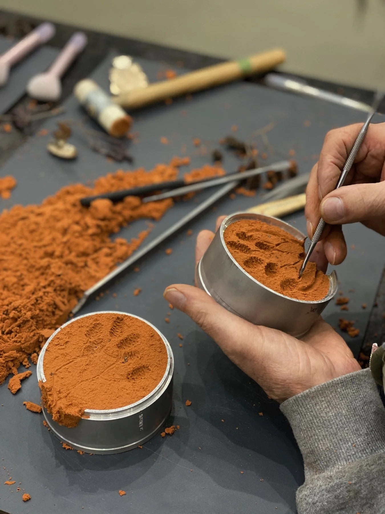 Aber vergiss bitte nicht, dich angemessen zu kleiden. Das heißt geschlossene feste Schuhe und eine geschlossene lange Hose aus nicht-synthetischen Materialien und gegebenenfalls zurückgebundene Haare. Da wir mit öl- und lehmgebundenem Sand arbeiten werden, bietet es sich an, Kleidung mitzubringen, die auch mal dreckig werden darf und/oder eine Schürze.